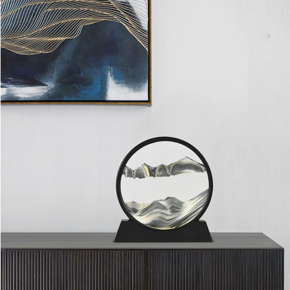 Pintura de arena dinámica 3D: hermosa vista, diseño simple, elegante y generoso.Estilo creativo: arenas movedizas delicadas con distintas capas y diferentes proporciones de arena, creando altibajos y una vista ordenada.Pantalla de iluminación: hay cambios de colores lentos, cambios de colores rápidos, un solo color fijo, 3 pantallas de iluminación controladas por un botón de interruptor táctil.